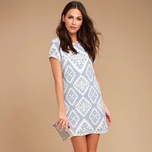 ✨Lulus Exclusive! Got a passion for patterns? You'll love the Lulus Give Me a Print Light Blue Print Shift Dress! Light blue and ivory print decorates woven poly as it shapes a rounded neckline, a darted bodice, and short sleeves. Shift silhouette falls to a flirty mini length. Exposed gold back zipper.