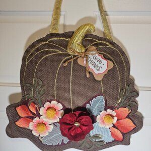 A pretty lightweight fall fabric burlap "Give Thanks" floral pumpkin door hanger. A large burlap fabric pumpkin that has golds thread accenting the ribs of the pumpkin. A luxe gold fabric stamp and gold wired ribbon hanger. There is a jute bow and near the bow a gift tag that has the phrase "Give Thanks". At the base of the burlap pumpkin are assorted flowers in shades of burgundy with gold metal center and cream with coral with yellow pom pom centers. Leaves in orange and shades of green accent of flowers. A great wall or door hanger to customize your home. Lovingly pre-owned. Approximate size 17 inches wide, 15 inches long. Not including hanger length. Non smoking pet free home.