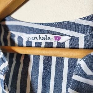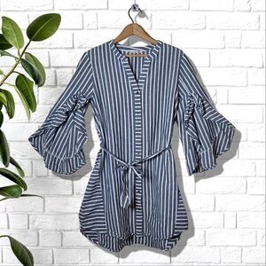 Given Kale Pinstripe Ruffle Split Bell Sleeve Waist Tie Tunic;