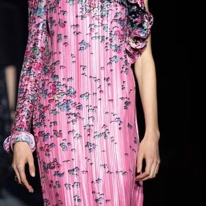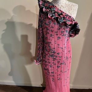 Romance is synonymous with Givenchy. This Floral Multi colored, pleated, dress is comfortable, featuring elegant slim lines around the bust and waist that flawlessly flatters the figure. One sexy shoulder, one long sleeve, ruffles along the neckline and hem.