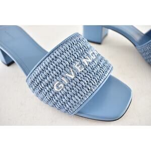 Givenchy 4G Denim Blue Raffia Logo Leather Slide On Mule Block Heel Sandal 39.5