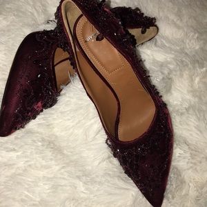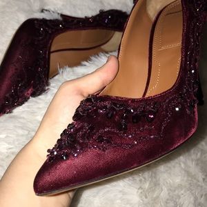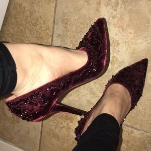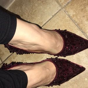 These heels are breathtaking in the pictures they don’t look as amazing as they do in person they have beads all around so stunning they shine maroon color so comfy like new