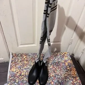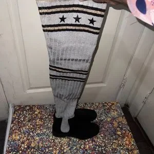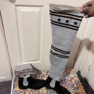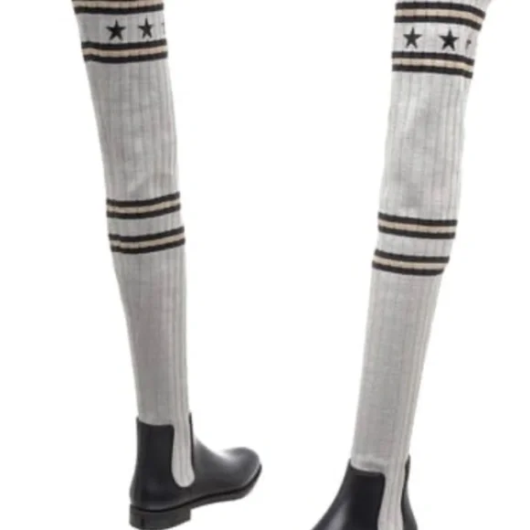 Givenchy black, gray, silver, and gold, over the knee boots; made of a combination of rubber and knit materials.