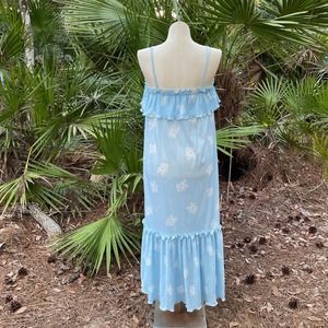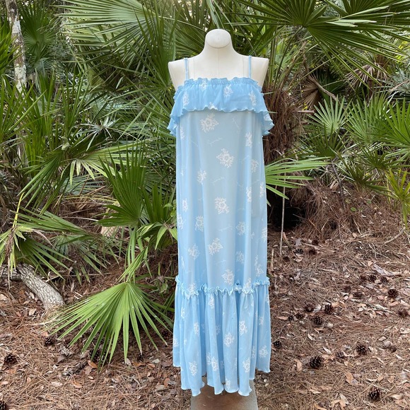 Poly or poly nylon blend. Sleeveless. Straight neckline with elastic. Micro pleated ruffle at hem and flounce at neckline. Spaghetti straps. Maxi Length. Blue background with white Givenchy signature and floral pattern. Deadstock, NWT.