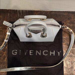 Chic Givenchy Antigona mini bag in hard to find gray blue color with shiny silver accents and long removable silver shoulder strap with a 19.5” drop. Has 3” rolled stationary top handles. Interior has cotton lining with one zip and two slip pockets. Comes with dust cover and original tags. Super clean and in excellent condition. Carried once only to an event. I personally think it leans a little more to blue than gray although blends with both colors.