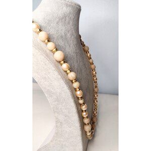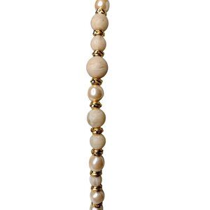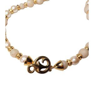 This is a stunning necklace at 17" long in Baroque cream faux pearls, gold tone beads in-between & swirled acrylic beads in a beige & white color. The clasp is signed & very pretty itself with a great detail.