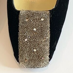 These Givenchy flats feature a sleek black design with a striking metallic accent on the toe, offering a sophisticated yet versatile look. Crafted for comfort, they boast a classic square toe and a slip-on style, making them perfect for both casual and dressier occasions.