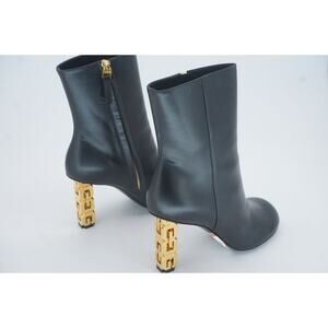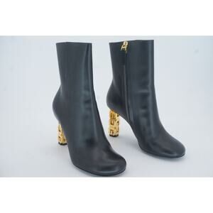 GIVENCHY BLACK G CUBE LEATHER ROUND TOE ANKLE BOOTIES SZ 37 GOLD LOGO HEEL $1400