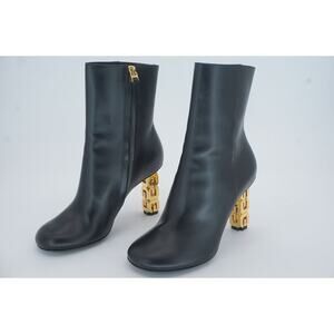 GIVENCHY BLACK G CUBE LEATHER ROUND TOE ANKLE BOOTIES SZ 37 GOLD LOGO HEEL $1400