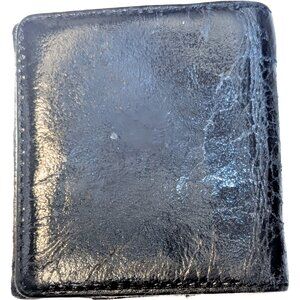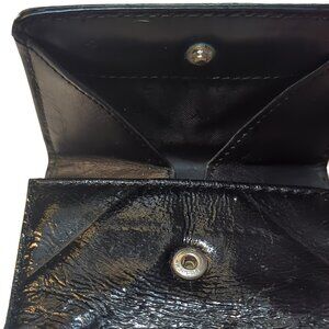 Snap closure under logo side opens to coin compartment. Snap closure on back opens to wallet section with 4 card slots and bill fold.