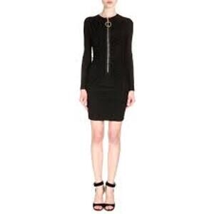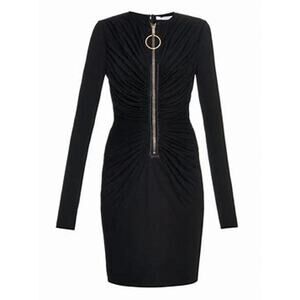 Elegant black mini dress by Givenchy. Features a gold zipper detail. Long sleeves and ruched design.