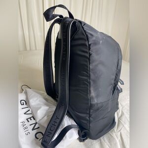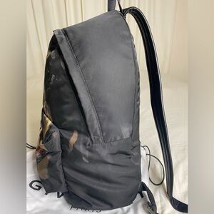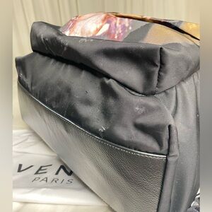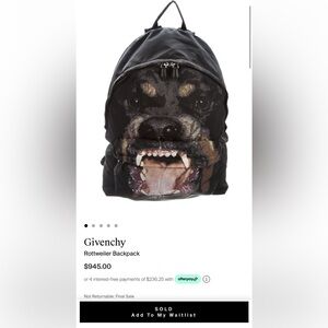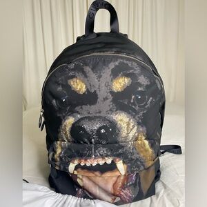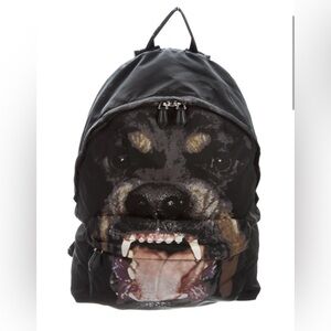 This Givenchy backpack features a Rottweiler print on black nylon. It is a medium-sized backpack with a zip closure, designed for casual occasions. Leather durable straps. Made in Italy, it includes outer and inner pockets, adjustable straps, and is water-resistant. The backpack is lightweight and comes with a dust bag, making it a limited edition designer piece.