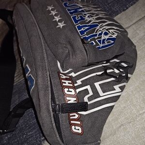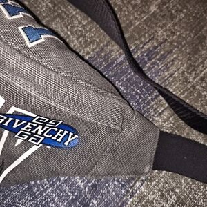 Chic Givenchy belt bag in black with bold blue details. Ideal for adding luxury to casual wear. Belt bag in good condition there is some color fading but it looks intentional. Gives the bag character. There is a bigger color fading in the back or a stain but not very noticeable. The leather zipper pull is missing on the small zipper pouch but fully functional.