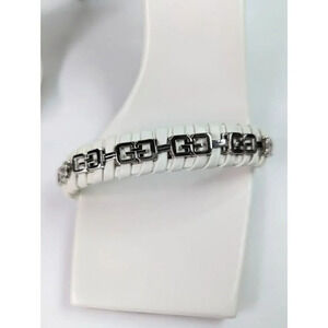A delicate slingback leather design defines these stiletto sandals. The braided front strap is embellished with double G chain in polished metal while the back strap is rendered in elastic silicone with debossed 4G emblem.