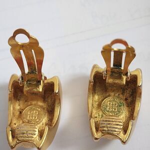 These vintage Givenchy earrings are a unique addition to any jewelry collection. The oval cabochon faux pearls are set in a hammered gold tone with a pavé setting style. The huggie style clip-on closure makes them easy and comfortable to wear, and they hang at a length of 1". These earrings are signed by the designer and are in their original, undated condition. Add some beauty to your jewelry collection with these classic vintage earrings