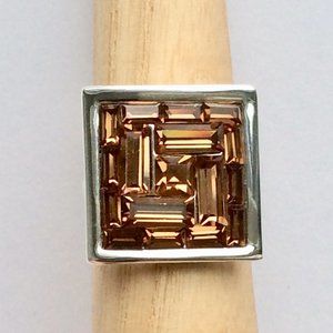 Smoked Topaz Swarovski crystal baguettes and squares set in rhodium plate .
