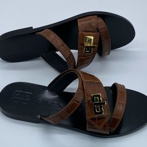 Brand-new Luxe leather slides featuring a turnlock buckle and a croc-embossed finish. * Leather upper * Open toe * Slip-on style * Leather lining * Leather sole * Made in Italy