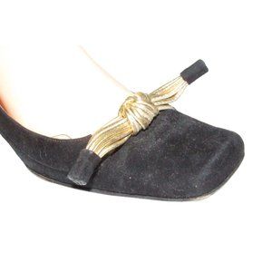 For sale are a pair of stunning! vintage, Givenchy, size 38, black Black Peau de Soie suede, dressy flats with gold knotted bows. These amazing, vintage flats have a leather sole, square toe, and were made in Italy. INV D15