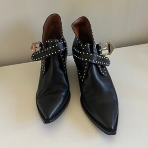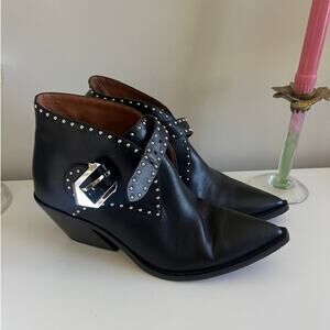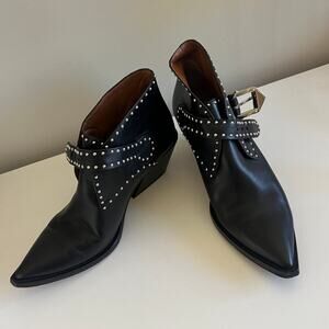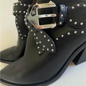 Smooth leather western ankle boots featuring metal studs and buckle, wide heel and leather sole.