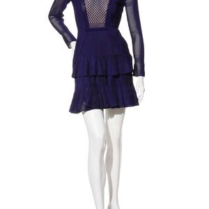 Rare and collectible Givenchy Fall/Winter 2022 runway dress. Crafted in Italy from ribbed knit viscose blend with sheer mesh details at the chest and sleeves. Features long sleeves, fitted waist, and a tiered pleated mini skirt.