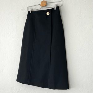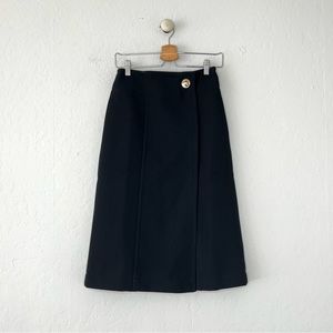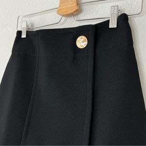 Beautiful black wrap skirt with a golden twist clasp. Clasp and button fastening, opening slit on front and two slits on the back, lined. Made of thick wool fabric with a mesh surface.