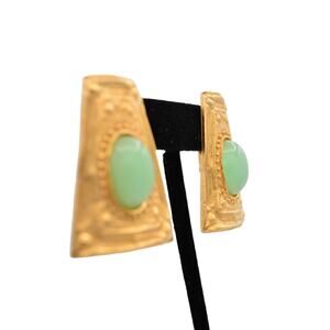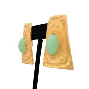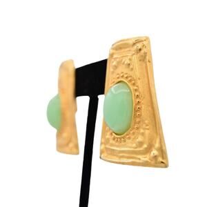 Givenchy Green Cabochon Earrings Brushed Gold Chunky Signed Vintage 1980s BinQ