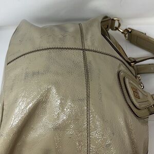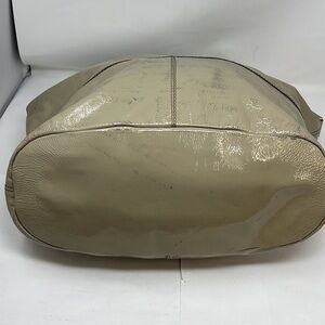 This is a great pre owned Givenchy Large Gray Taupe Patent Leather Nightingale Bag. As you can see there are marks on the baton both sides. No tears. No odors. Shoulder strap is detachable. Matte gold hardware. Clean interior with some discoloration, as shown. Two slip in pockets, one zipper wall pocket. 20” W x 12” H x 5.5”D with 5” flat handles and a longer detachable handle.
