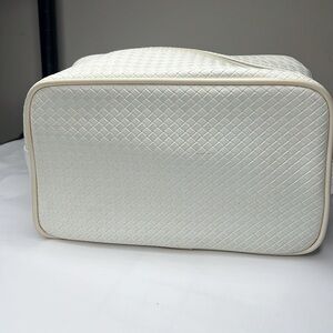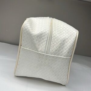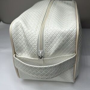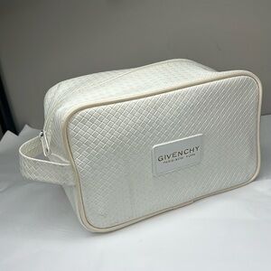 This is a great Givenchy Large White Leather Like Embossed Clutch Dopp Travel Zip Case. Minor scuffs and spotting both on the exterior and interior. No tears, no odors. 9” x 5.5” x 5” with side handle.