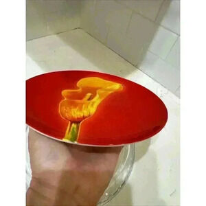 This collector plate by Givenchy features a beautiful calla lily in red on a ceramic material with a round shape and a diameter of 8 inches. The plate is part of the "Les Fleurs de Parfums Givenchy" collection and is perfect for all occasions. It is microwave and dishwasher safe, making it convenient for use and cleaning. The late 20th-century plate is a great addition to any collection and is sure to add a touch of French culture to your decor. The plate is not antique or vintage but is a beautiful representation of the Givenchy brand.