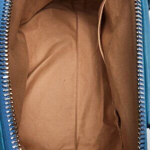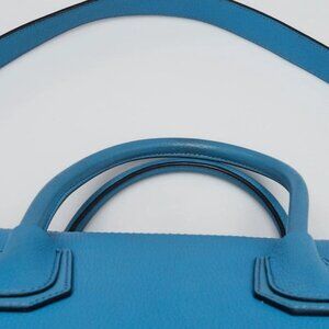 The exterior leather is clean and beautiful, but has some scuffs on the bottom corners, creasing on the sides, and faint marks on the body of the bag. The handles are slightly discolored and show rubbing but the strap is smooth and clean. The hardware is bright and shiny. The interior is in good condition overall with light signs of wear to the lining.