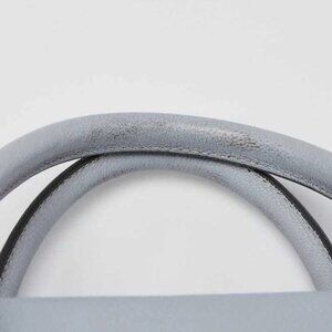 The exterior leather is clean with no obvious wear. The leather strap remains clean with light creasing. The handles are clean but have rubbing and soiling to the undersides of the handles. The silvertone hardware has surface scratches but is bright and crisp overall. The interior lining is clean and remains in great condition.
