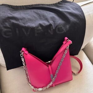 Mini Box Calfskin neon pink cutout crossbody by Givenchy. Features a silver box chain, pink shoulder strap, silver hardware with latch closure.