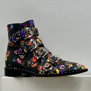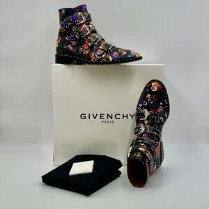 From the House of Givenchy, I have for sale a pair of their spectacular four buckle ankle boots. These are real showstoppers! They were created in Italy of canvas and leather and feature the patented "Night Pansy" motif. In addition to the four buckles that are absolutely scratch free, the boots are embellished with studs on the topside portion of the sole and continues on to every strap on the boots. The soles are leather as well with a rubber heel so you don't slip in inclement weather. I wore the boots twice so there is a "break-in" crease at the instep as well as wear to the sole wear I walk on pebbly streets in Boston. Other than that, they are in fantastic condition. The feature a 1" heel and the buckles allow you to fit them to your own width. The boots will come to you as shown with the original box, two dust bags and care card.