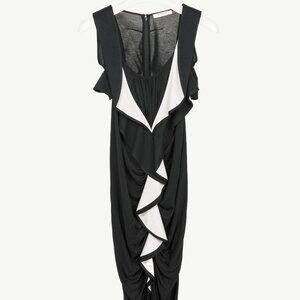 Made in Italy, this dress from Givenchy's 2013 Pre-Fall and Winter collection is crafted in a heathered black silk-blend jersey, and is embellished with white-trim ruffles down the front. It features a sleeveless design, a gathered scoop neck, a knee-length hem, and an invisible back zip closure.