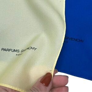 Keywords: Givenchy Parfums, vintage handkerchief, yellow handkerchief, blue handkerchief, Givenchy scarf, polyester scarf, Givenchy collector, logo scarf, designer accessory, luxury handkerchief, Givenchy Paris, giftable handkerchief, vintage scarf set, Givenchy logo accessory, collectible Givenchy, designer vintage, scarf duo, bright scarf set, Parisian small scarves givenchy