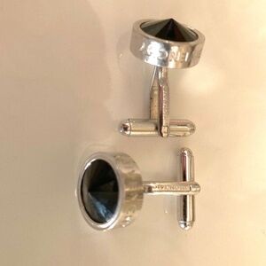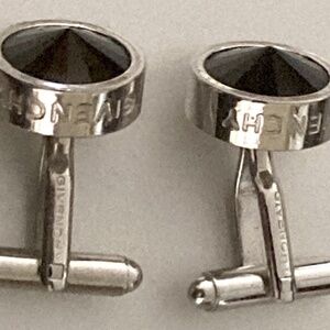 Authentic Givenchy Paris luxury cufflinks featuring striking black pyramid-cut studs set in polished silver-tone frames. Bold, architectural design with unmistakable French fashion house authority. Signed “Givenchy Paris” on the toggles, confirming authenticity. Excellent pre-owned condition with strong shine. Originally positioned at premium boutique pricing — now offered at a rare secondary-market opportunity. Ideal for black-tie, formalwear, executive styling, or an exceptional designer gift.