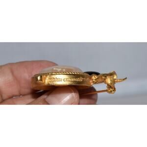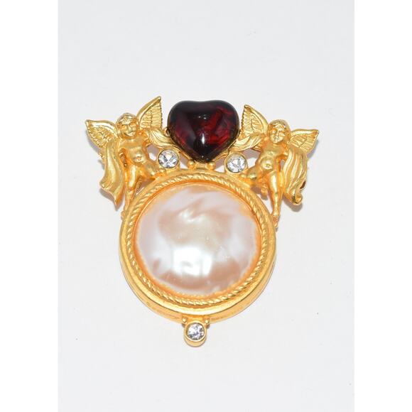 Dimensional brooch, featuring large faux pearl, clear rhinestone, cherubs, glass red heart on gold tone metal. Exquisitely designed and elaborately constructed. Pieces placed firmly are intact.