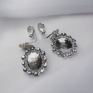 These earrings feature an oval/flower design with glass rhinestones set in a silver tone metal. These earrings measure approximately 1 7/16" in length and 12/16" in width and have clip closures. Both feature Givenchy's logo on the back, where there is some very slight wear. Other than that, this pair is in nearly like new condition with a tight grip and beautiful sparkle!