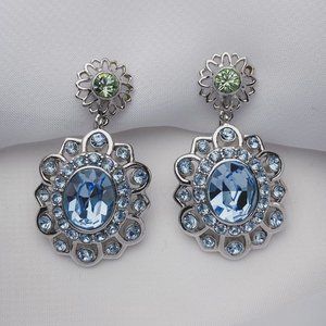 Givenchy Pastel Blue Rhinestone Jewel Flower Oval Silver Dangle Clip Earrings