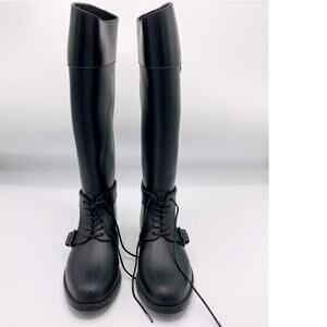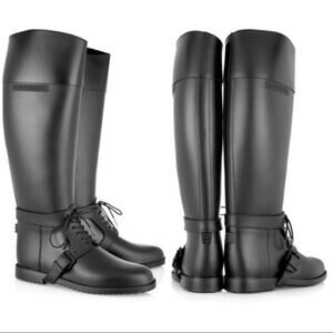 Step into the rain with Equestrian confidence in your Givenchy Rain Boots. These durable rubber boots feature tonal laces, wrap around harness belt, and knee-high length. These shoes can be paired with denim or and all black outfit for your aesthetic.