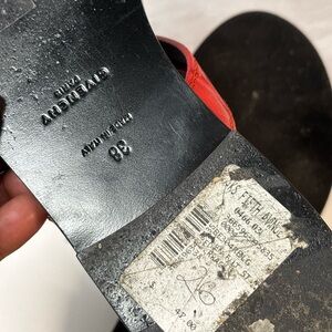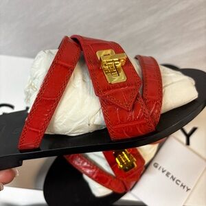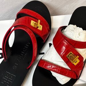 Elegant red sandals with gold buckle. Stylish and comfortable. Perfect for any occasion.