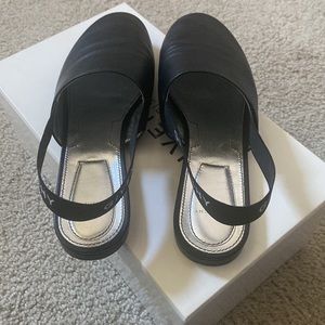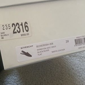 Black smooth leather with Elastic ankle strap, white lettering “GIVENCHY” slingback, elastic strap