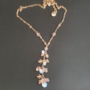 Givenchy necklace is rose gold with aurora borealis beads. Chain adjusts from 15 to 18 inches with a fold-over clasp. Y-drop is 3 inches long. Very good condition