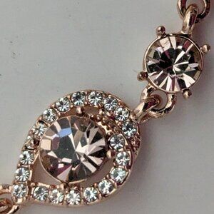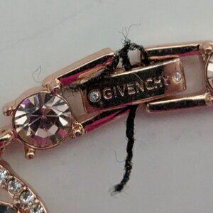 The Givenchy Runway Rose Gold Tone Bracelet features pear-shaped morganite-like peach stones and small crystal-type stones set in rose gold metal. This stylish tennis type bracelet is signed by the brand and is perfect for those who appreciate beauty, art, and fashion. The elegant design makes it a versatile piece that can be worn for various occasions, adding a touch of glamour to any outfit. With its stunning color combination and high-quality materials, this bracelet is a must-have accessory for anyone looking to elevate their jewelry collection.