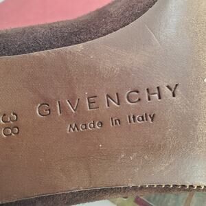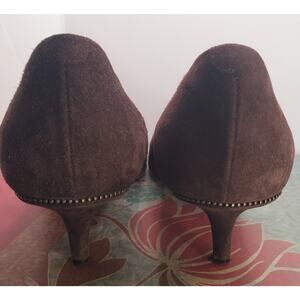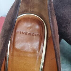 In wonderful clean condition. Maybe worn twice. These Givenchy shoes are a stylish pair of dark brown suede pointed toe pumps with a kitten heel. They feature a slip-on closure, studded accents, and metal trim around the bottom of the shoe. With a moderate cushioning level, leather outsole material, and standard shoe width, these designer heels are perfect for casual occasions during the winter and fall seasons. Made in Italy, these shoes exude a city-themed charm with their solid brown color and unique features, making them a fashionable choice for any woman's wardrobe.