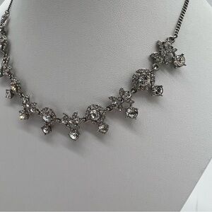 This exquisite Givenchy necklace showcases a delicate silver design adorned with vintage-inspired crystal clusters. The symmetrical pattern and refined chain create a sophisticated piece, perfect for special occasions.
