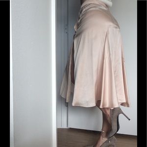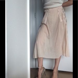 Peach / cream colored midi skirt, high rise, with side pockets and shear front that shows legs. Very modern, elegant and unique design . Openwork that is faithful to Givenchy’s teasing view of femininity.