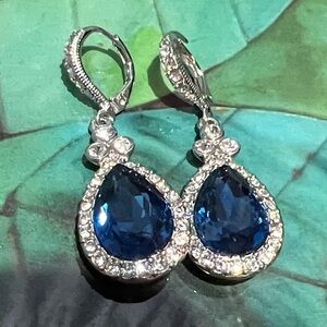 Stunning tear drop earrings with deep blue stones. Surrounded by shimmering crystals in a silver setting. Perfect touch of elegance.