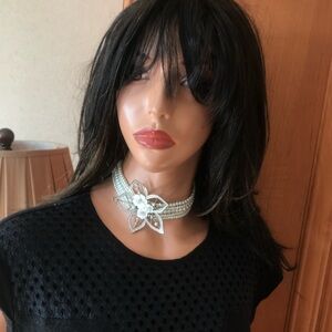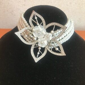 Elegant Givenchy necklace with floral design. Features crystals in silver setting and white pearls strands. Perfect for special occasions. Rare Designer piece. Like new!