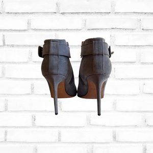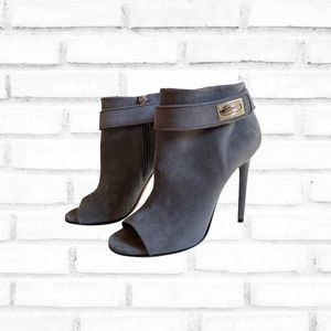 These classic Givenchy suede shark-lock open toe booties in grey are the perfect bootie for any occasion. Wear with leather pants and a tee for the ultimate edgy dinner outfit or with a midi skirt to look super styled! Gently used. Only signs of wear are on insoles (light compression) and on the soles of these beautiful babies.